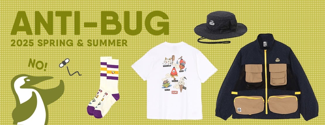 ANTI-BUG系列採用CHUMS經典TEE布料, 質地堅韌,並經過驅蟲處理。這種驅蟲劑為氯菊酯,結構與菊科植物中的天然驅蟲劑相似。它對人類和動物 都安全有效