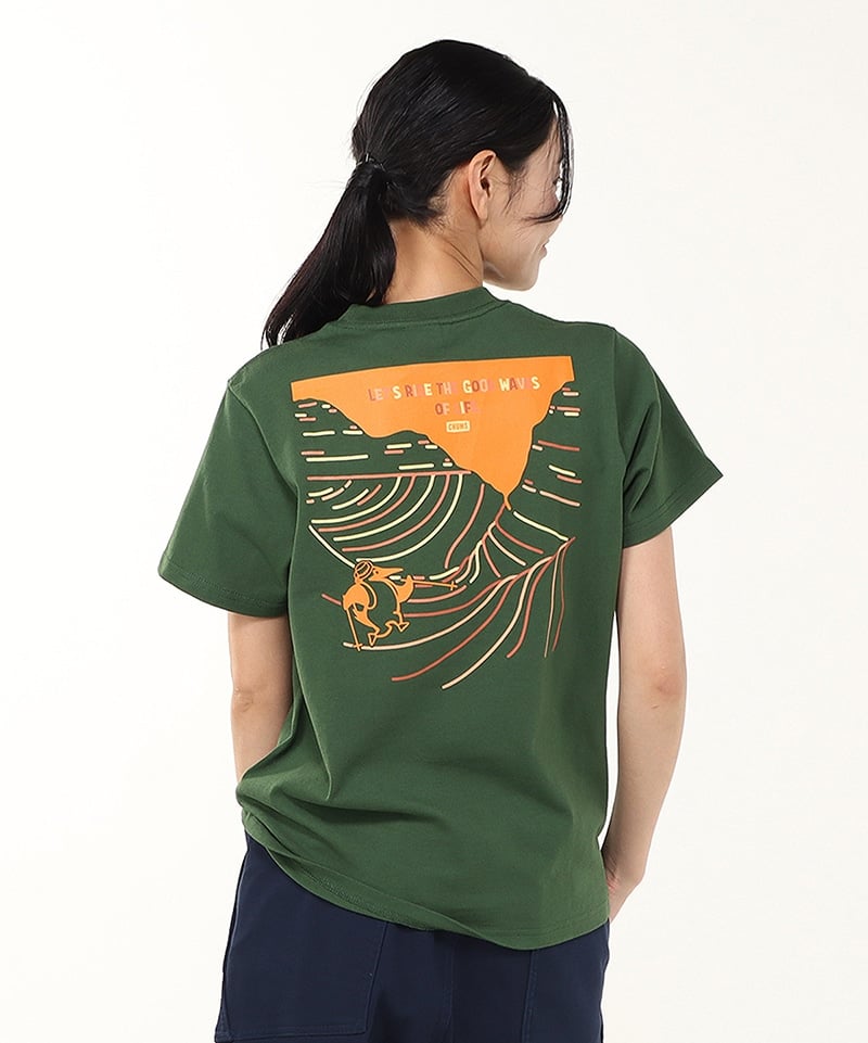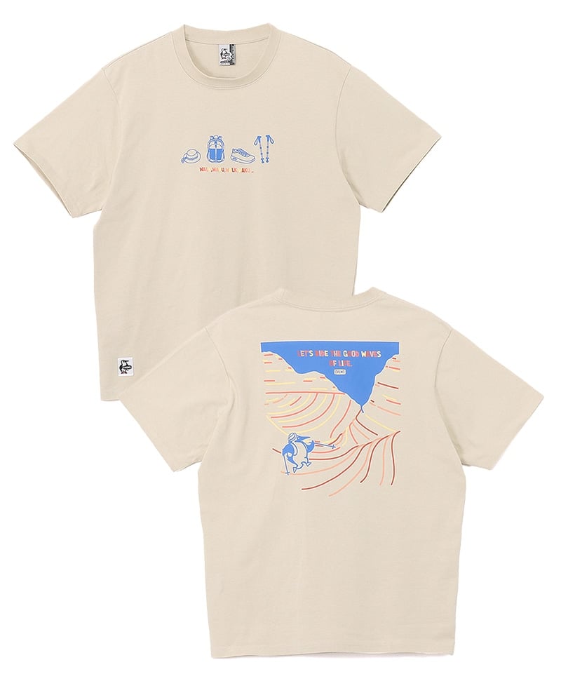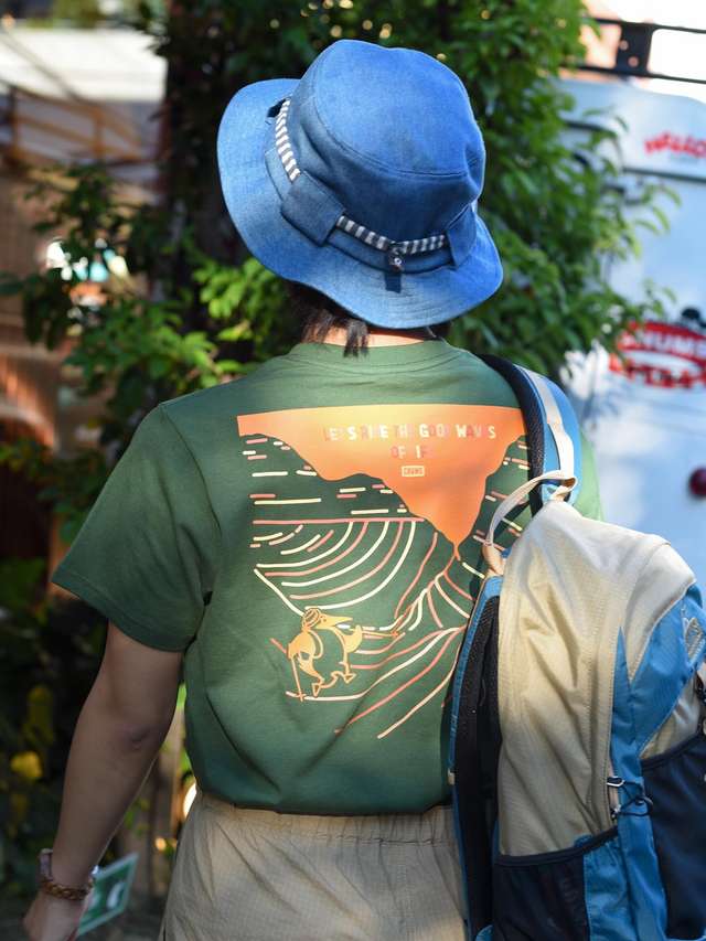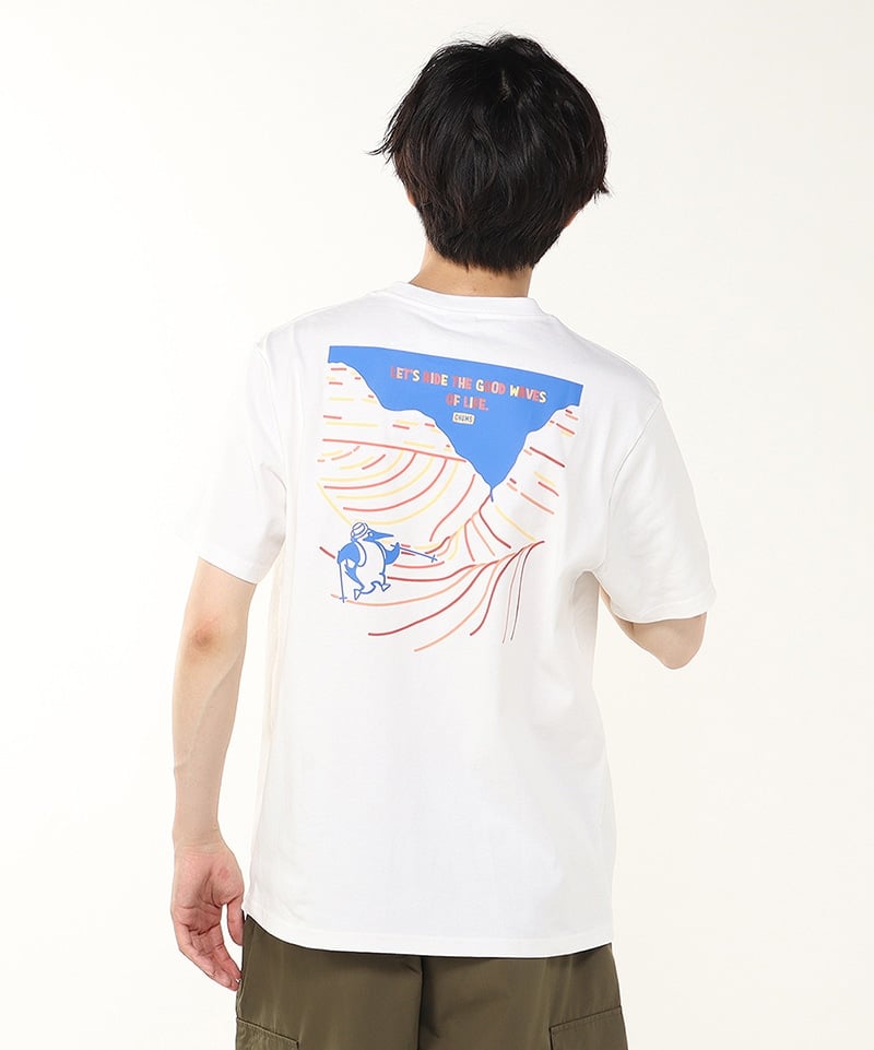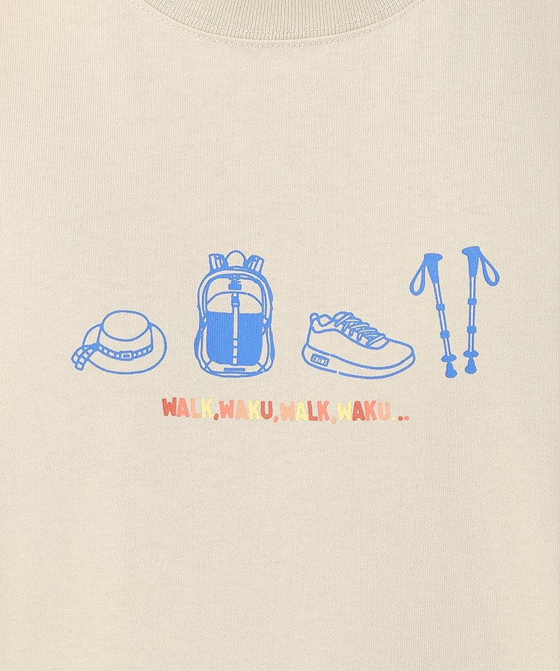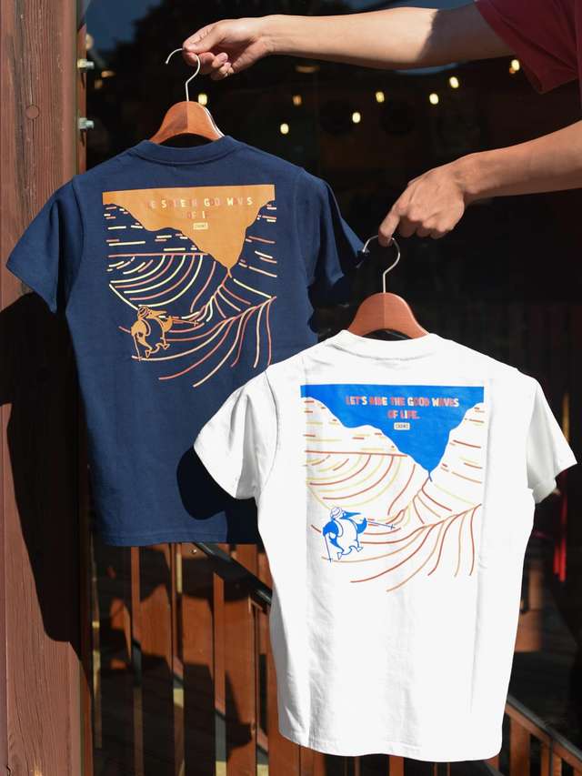 100% Cotton 這款圖案T卹描繪了Booby徒步前往猶他州偏遠地區「The Wave」的場景。 「The Wave」獨特的波浪狀地質構造以簡單的線條勾畫 正面印花融合了「WARK WARK」(指已準備好的健行裝備)和「WAKU WAKU」(指準備出發時的興奮之情)。背部印花寫著「Ride the good waves of life」(乘上美好的人生浪潮),將「The Wave」與生命本身完美融合 。
