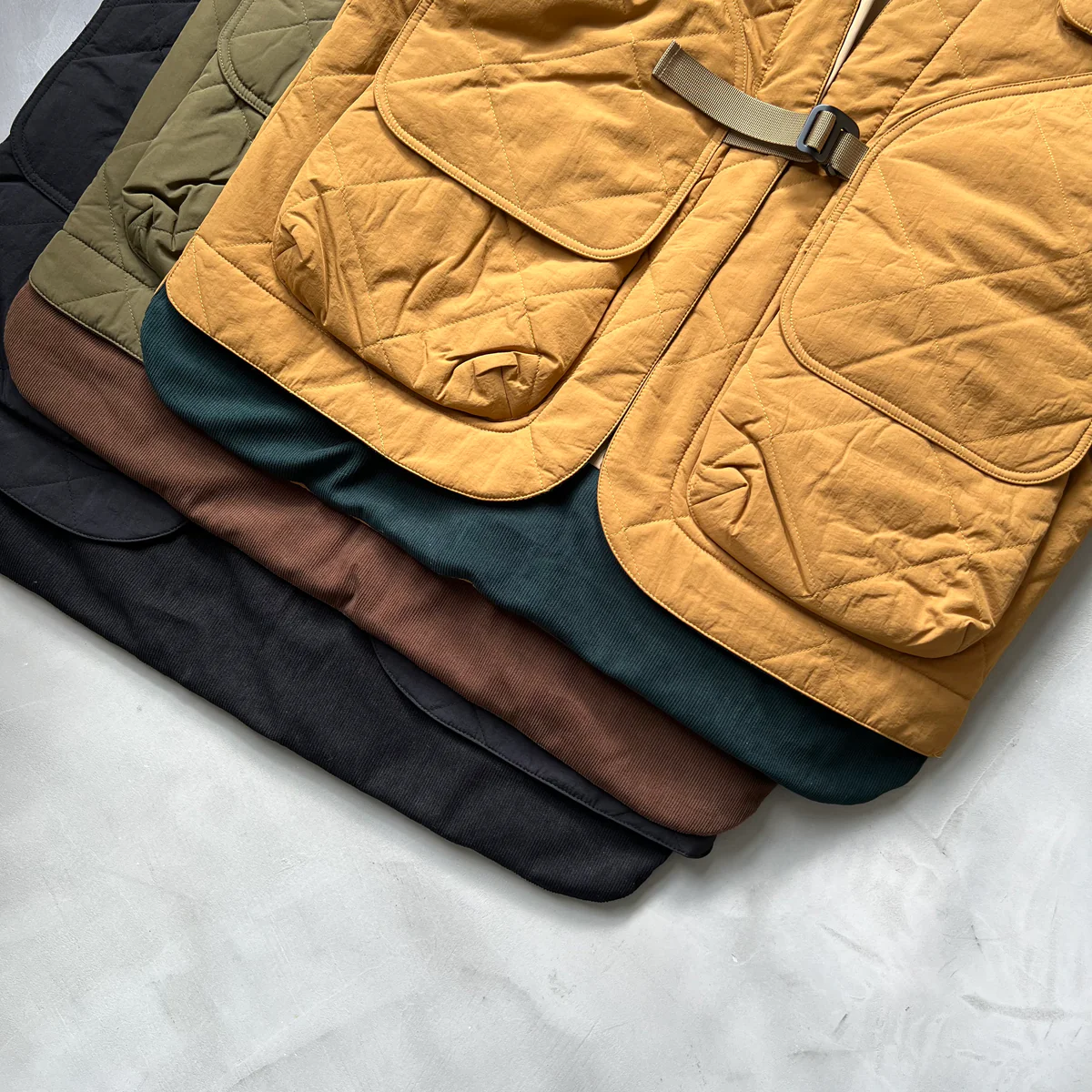 袖口內側和衣襟採用對比色的細羅紋燈芯絨布料