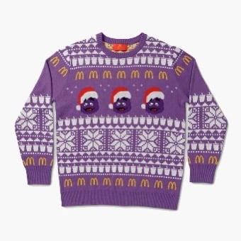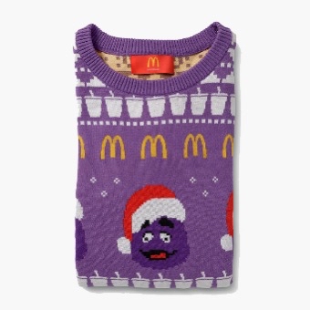 Fully knitted purple crewneck sweater featuring a white cup pattern, McD’s Golden Arches, three Grimaces wearing festive red-and-white hats, and snowflakes in various sizes. Material: 60% Cotton / 40% Polyester Unisex sizing Adult standard fit