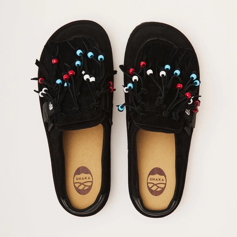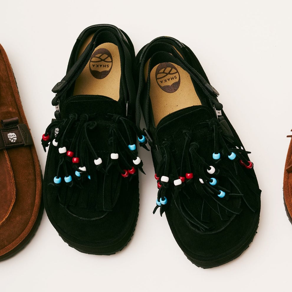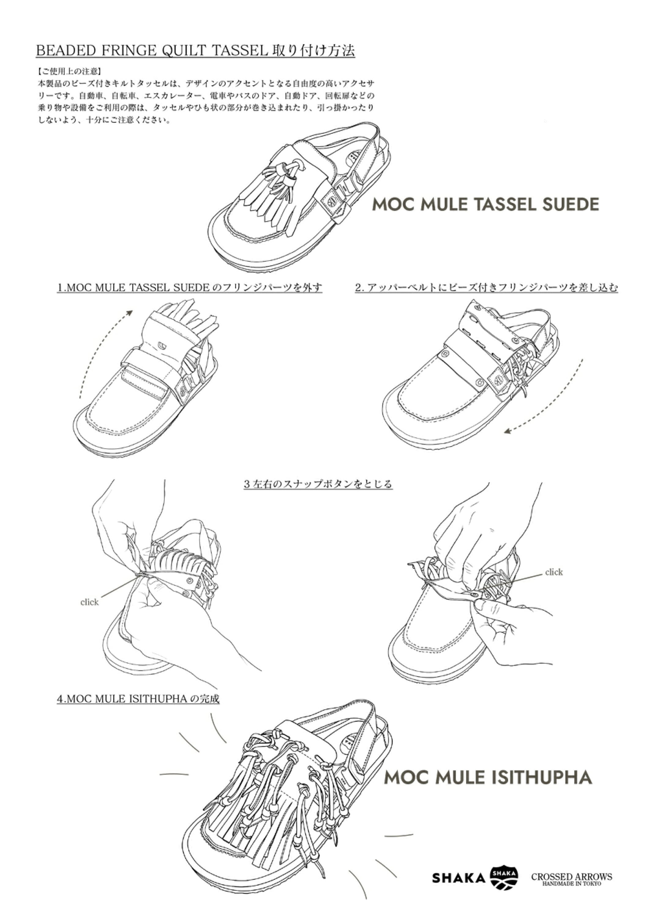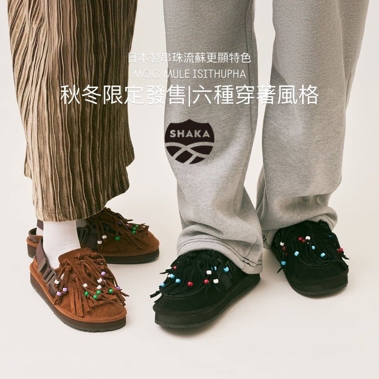 流蘇由日本知名皮革製品製造商 CROSSED ARROWS 特別訂製 採用美國小馬珠製成,從麂皮裁剪到珠子縫製,全程純手工製作 多達 6 種造型!百搭風格 -->自由更換鞋款及現有配件(流蘇、後跟帶等),即可打造多達 6 種不同的造型。 採用 SHAKA 原創的「鯊魚齒紋抓地鞋底」 鞋底輕盈,抓地力出色,略微加厚的鞋跟也提升了行走舒適度