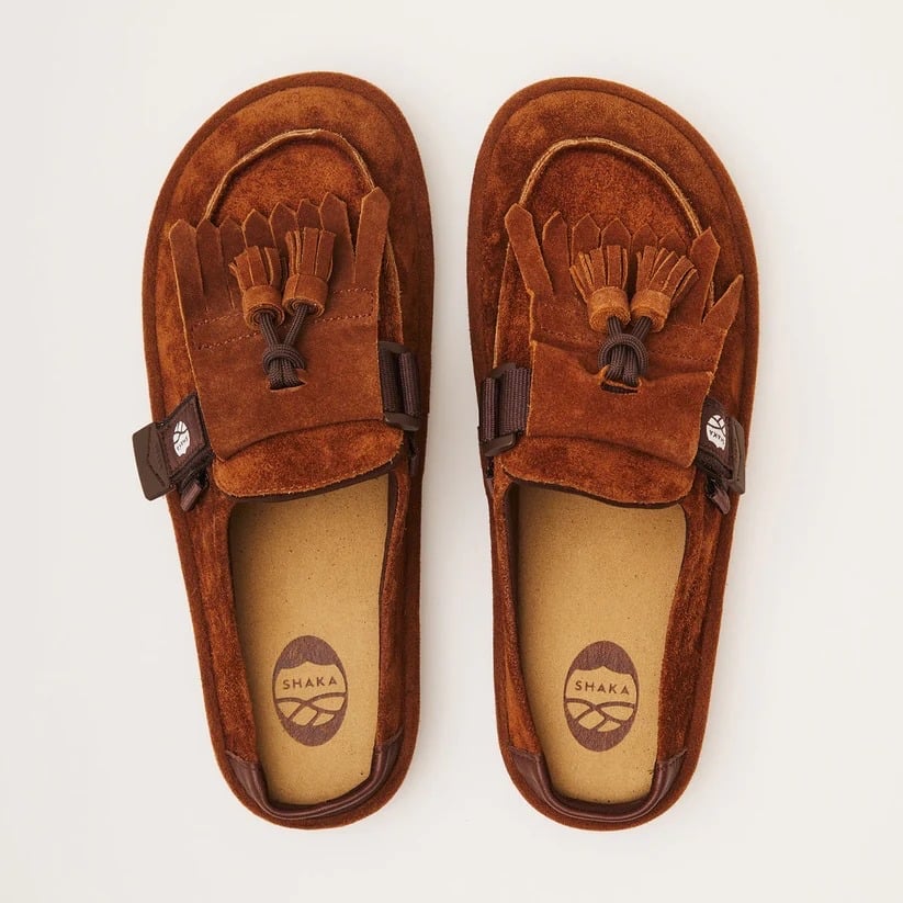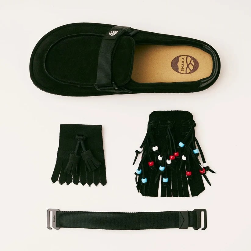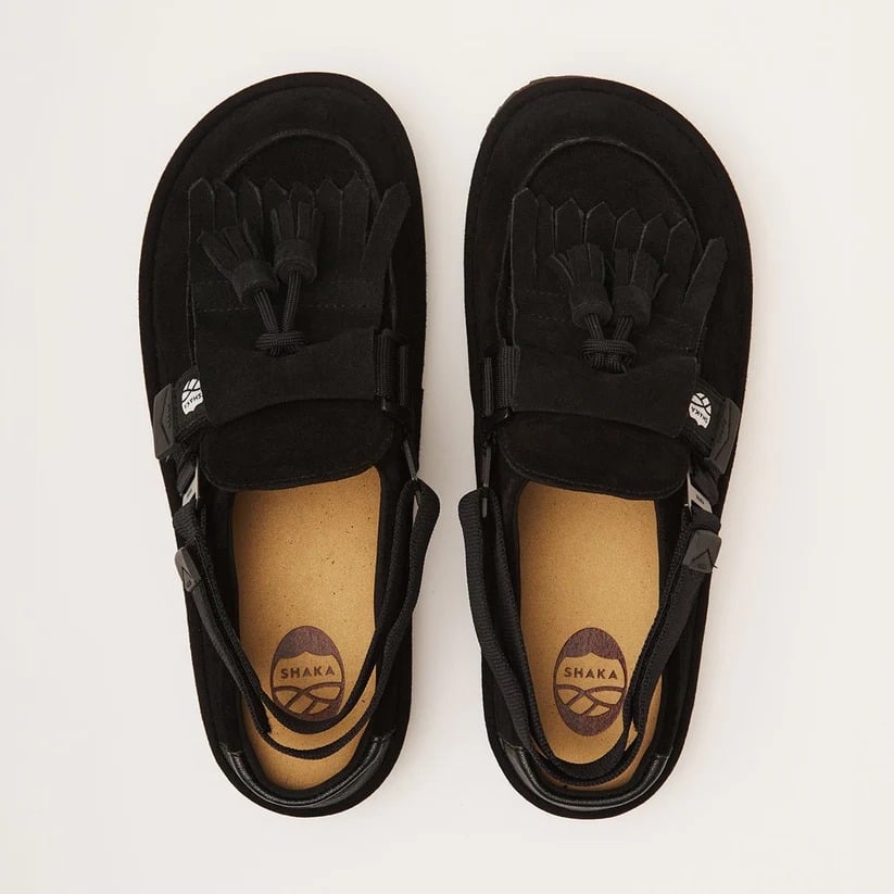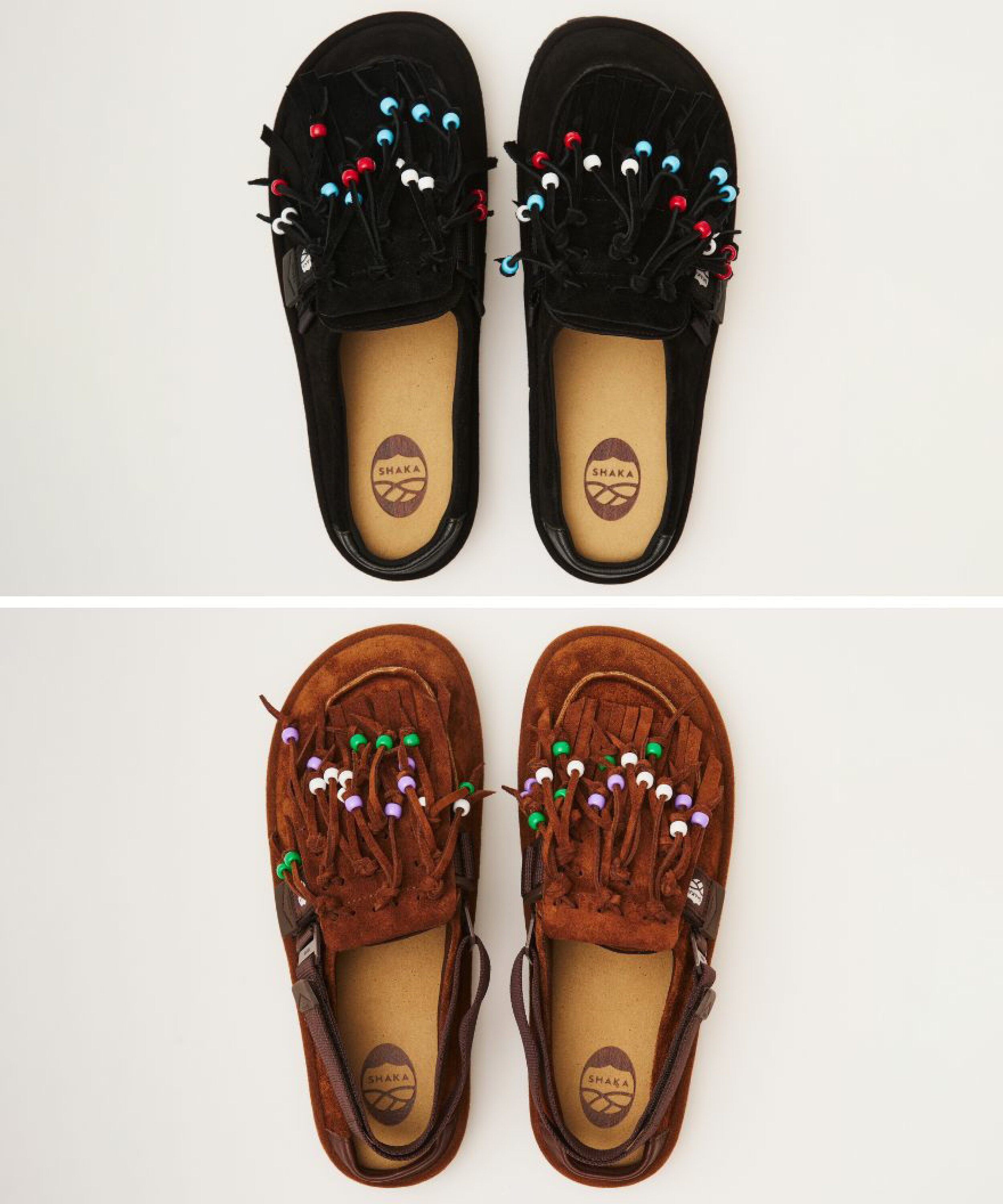 流蘇由日本知名皮革製品製造商 CROSSED ARROWS 特別訂製 採用美國小馬珠製成,從麂皮裁剪到珠子縫製,全程純手工製作 多達 6 種造型!百搭風格 -->自由更換鞋款及現有配件(流蘇、後跟帶等),即可打造多達 6 種不同的造型。 採用 SHAKA 原創的「鯊魚齒紋抓地鞋底」 鞋底輕盈,抓地力出色,略微加厚的鞋跟也提升了行走舒適度